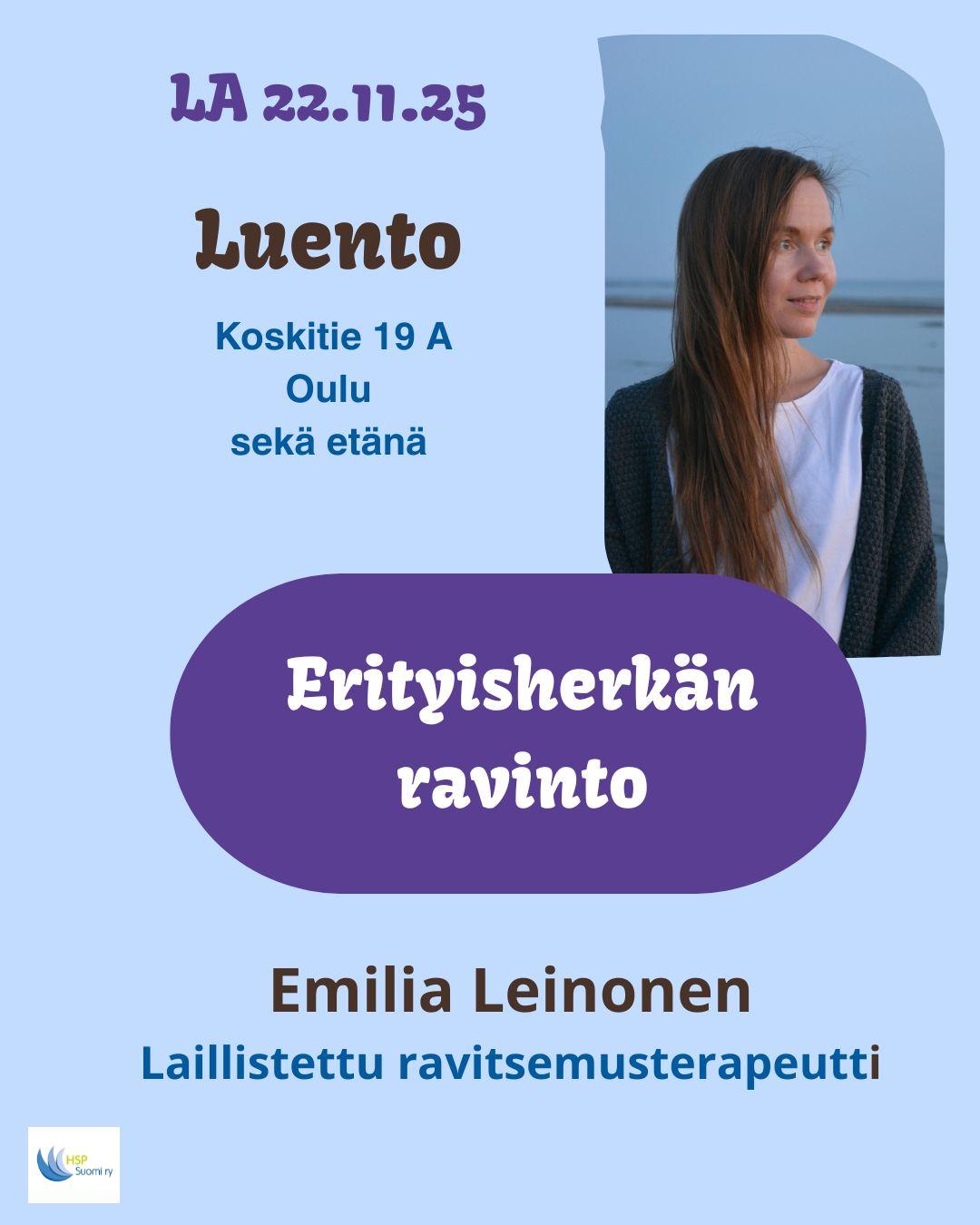 Luennon pitää laillistettu ravitsemusterapeutti Emilia Leinonen. Luennolla lähestymme terveyttä tukevaa ravitsemusta erityisherkkyyden näkökulmasta keskustellen ja pohtien aihetta yhdessä. Olet…