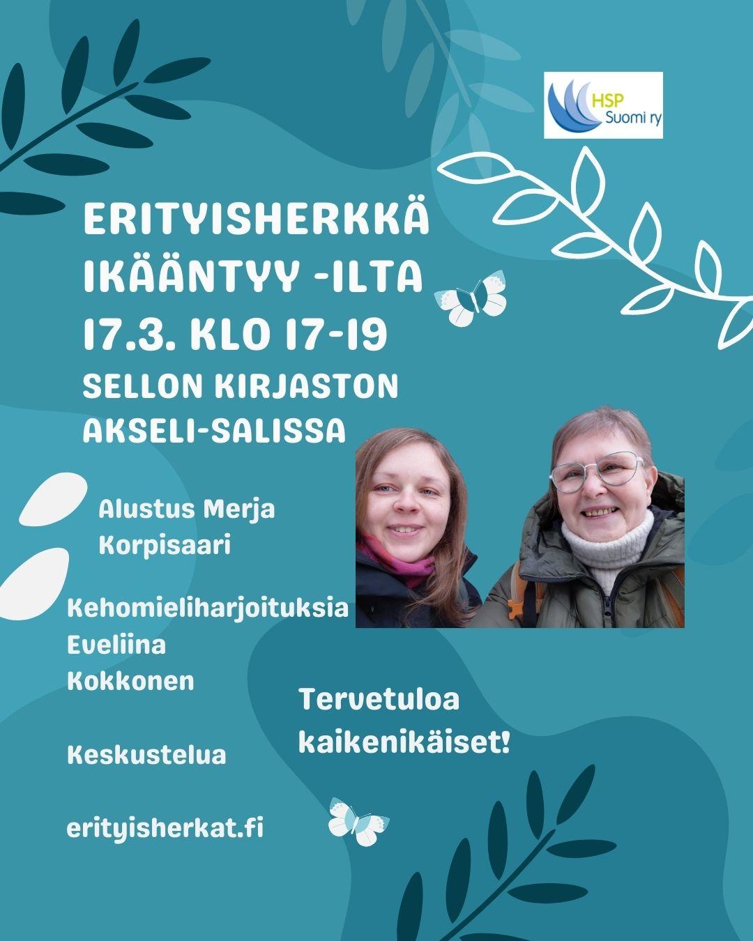 Kaikille avoin erityisherkkyysilta, jossa kuullaan alustus aiheeseen, tehdään keho-mieli - harjoituksia ja keskustellaan. Keskustelun alustaa HSP kokemusasiantuntija, KM Merja Korpisaari. Hengitys- ja…