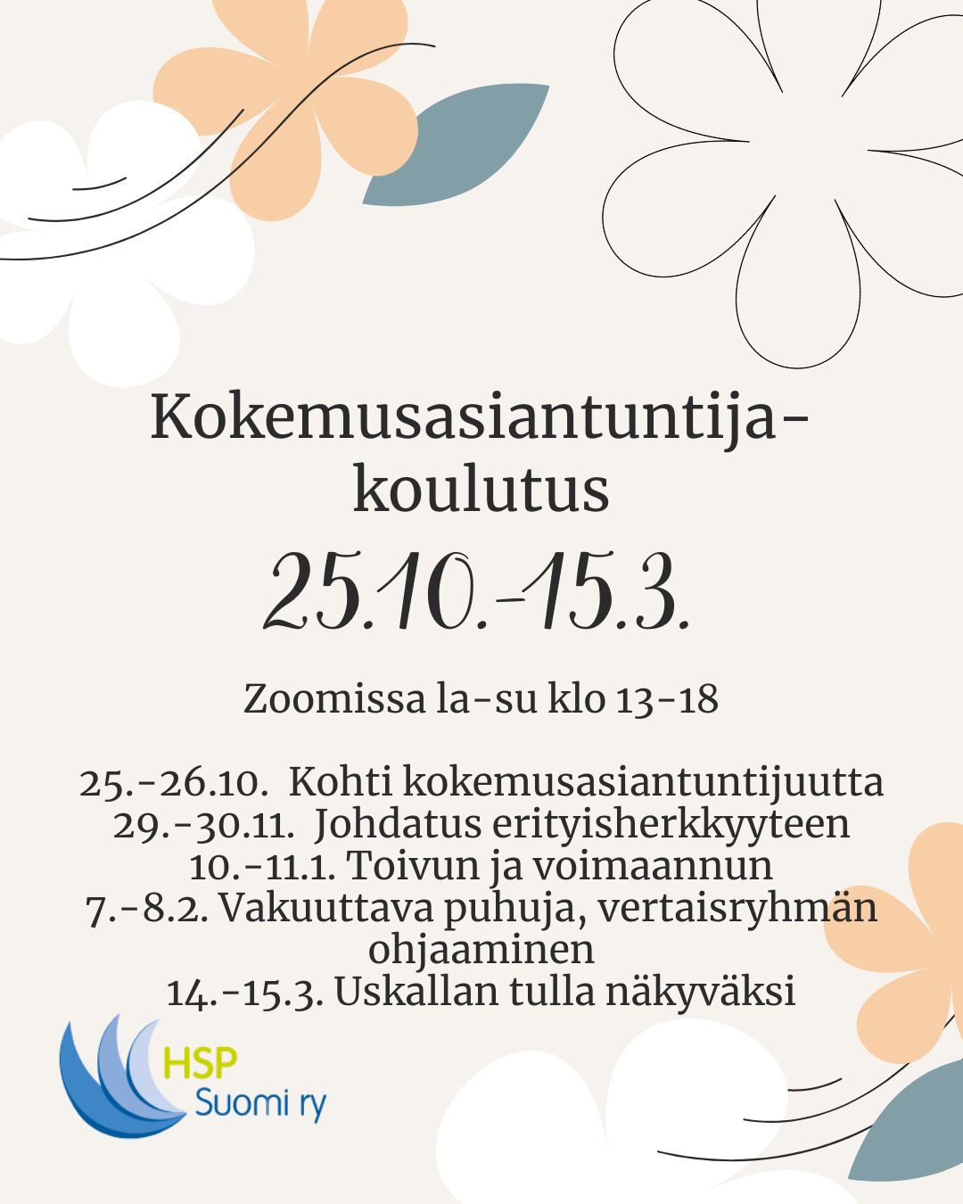 Koulutus on matka itseen ja samalla kasvumatkalla työstetään omaa erityisherkkyystarinaa ja tehdään siitä esitys. Koulutuksen aikana osallistutaan myös chattiin tai (etä)vertaisryhmään sekä yhdistyksen luennoille. Koulutuspäivät ovat klo 13-18.