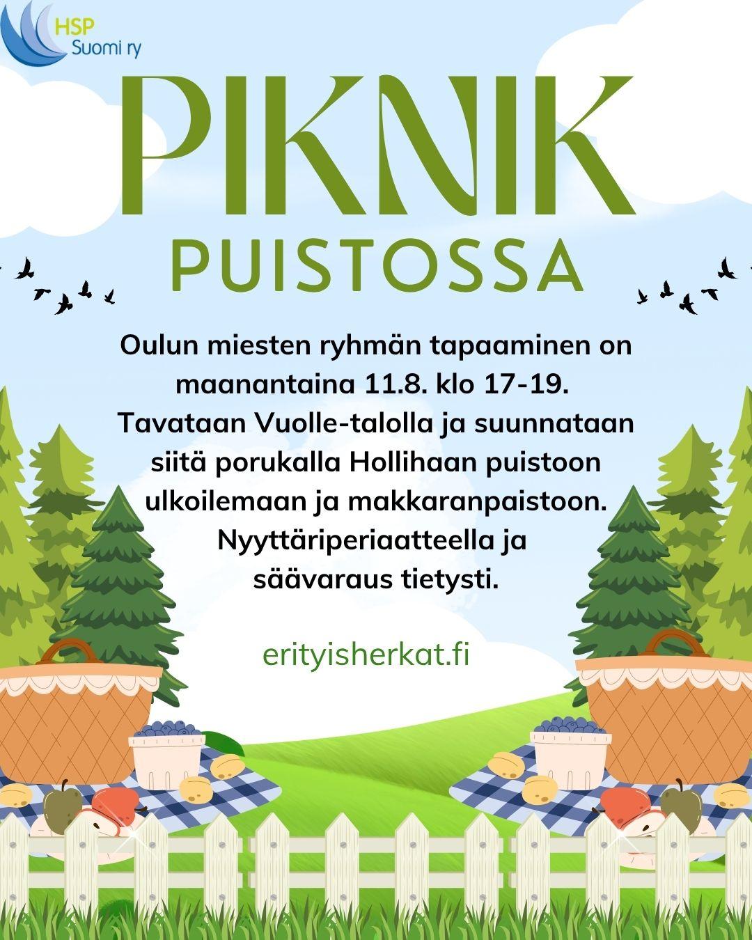 Elokuun miesten ryhmän tapaaminen on maanantaina 11.8. klo 17. Tavataan Vuolle-talolla ja suunnataan siitä porukalla Hollihaan puistoon ulkoilemaan ja makkaranpaistoon. Nyyttäriperiaatteella ja säävaraus tietysti.